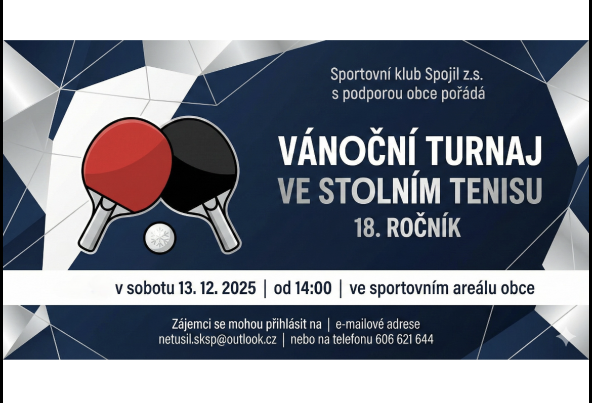 Vánoční turnaj ve stolním tenisu | 18. ROČNÍK | ve Sportovním areálu obce | přihlášky na 606 621 644
